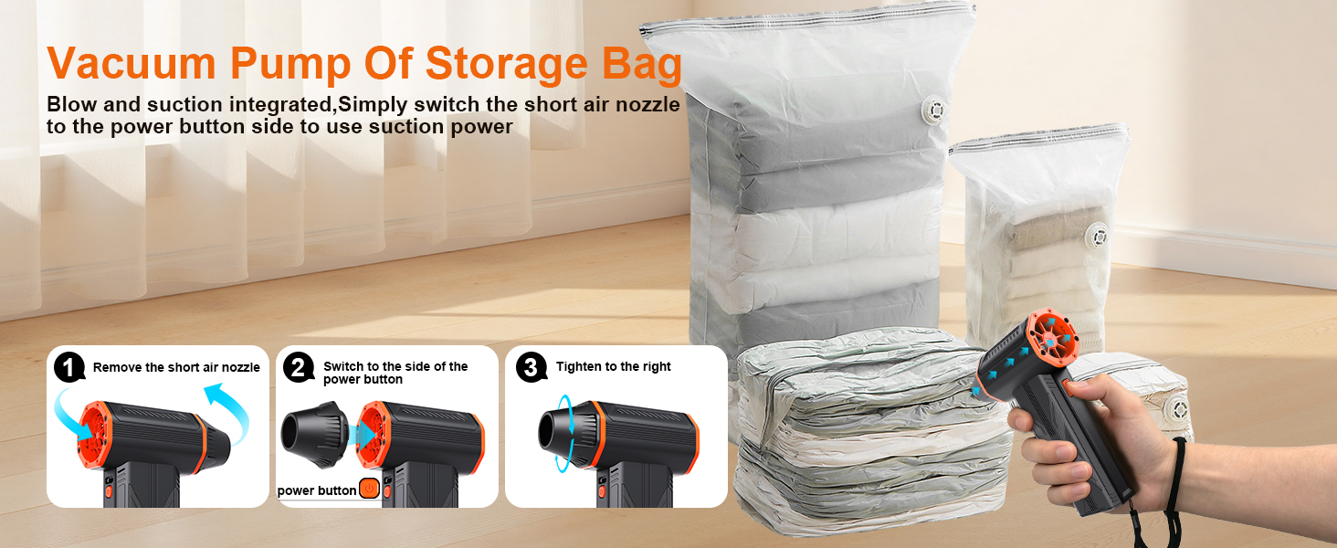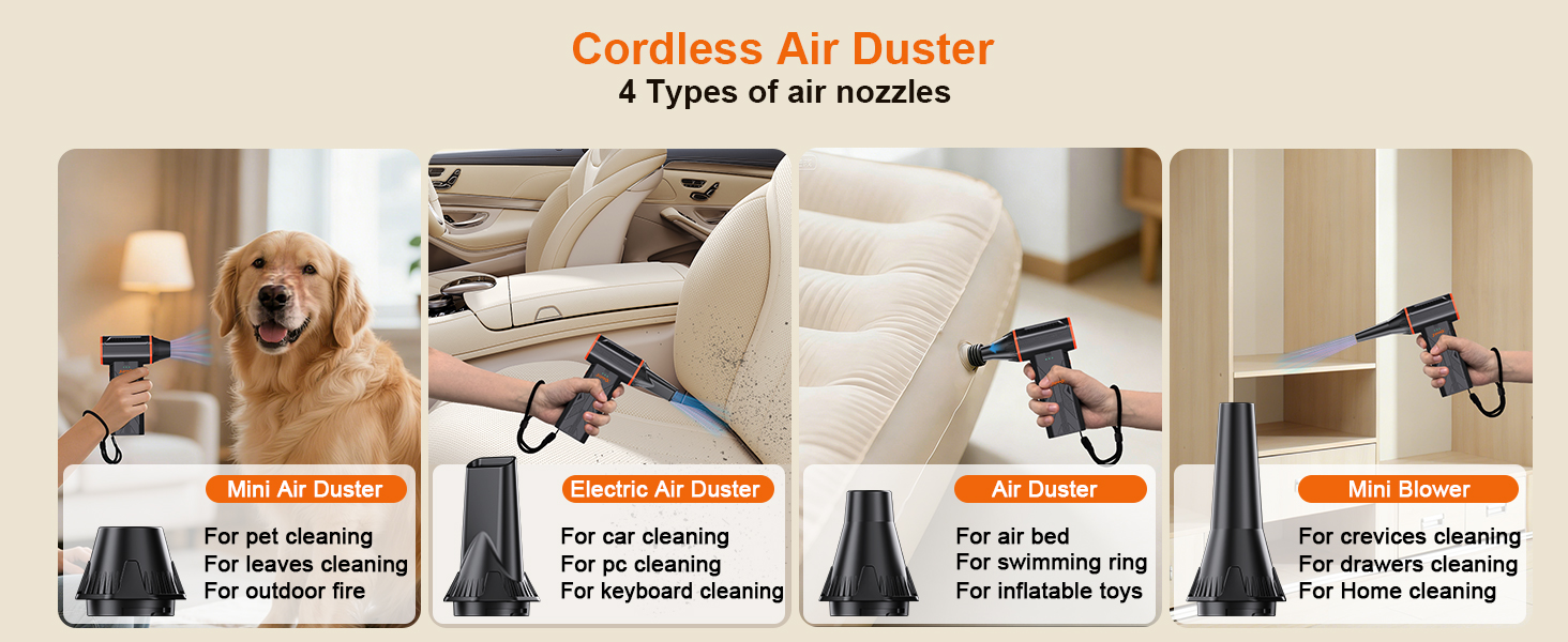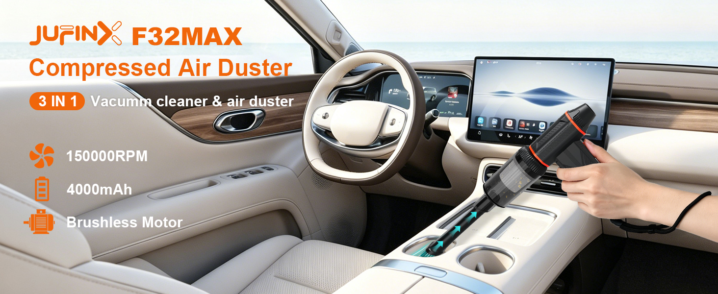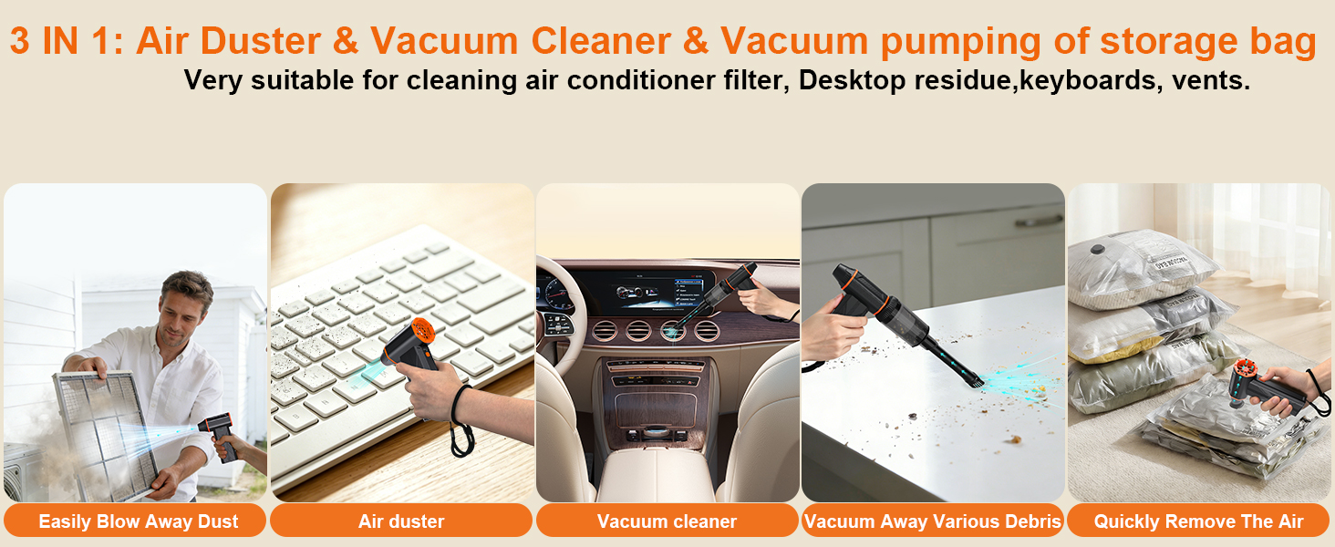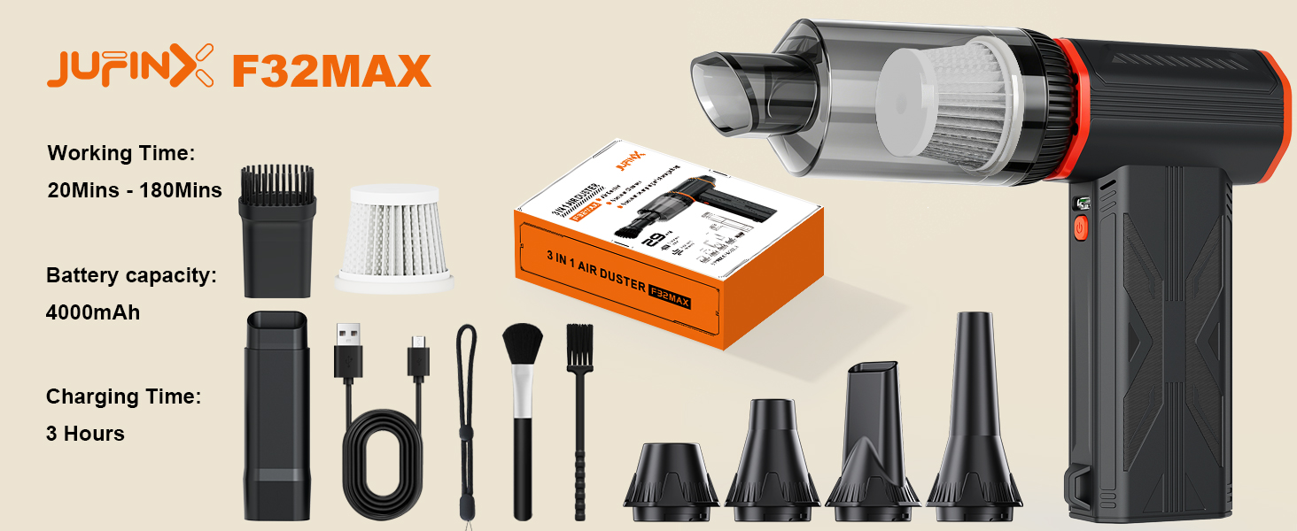 3-in-1 Air Duster & Vacuum Cleaner: Unlike other Electric Air Duster collectors, The F32MAX brushless motor has been upgraded to increase its suction capacity and equipped with a high-quality suction compartment. It can also be used in conjunction with vacuum storage bags, making it a great helper for home cleaning and storage, as well as outdoor travel.