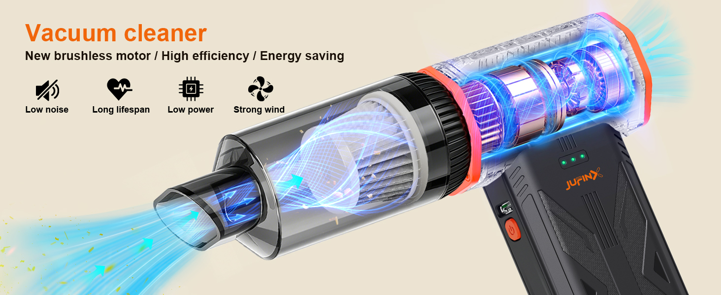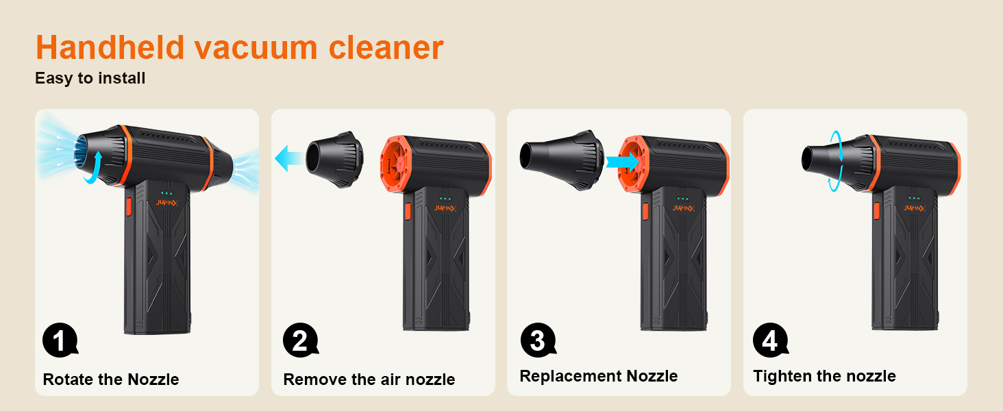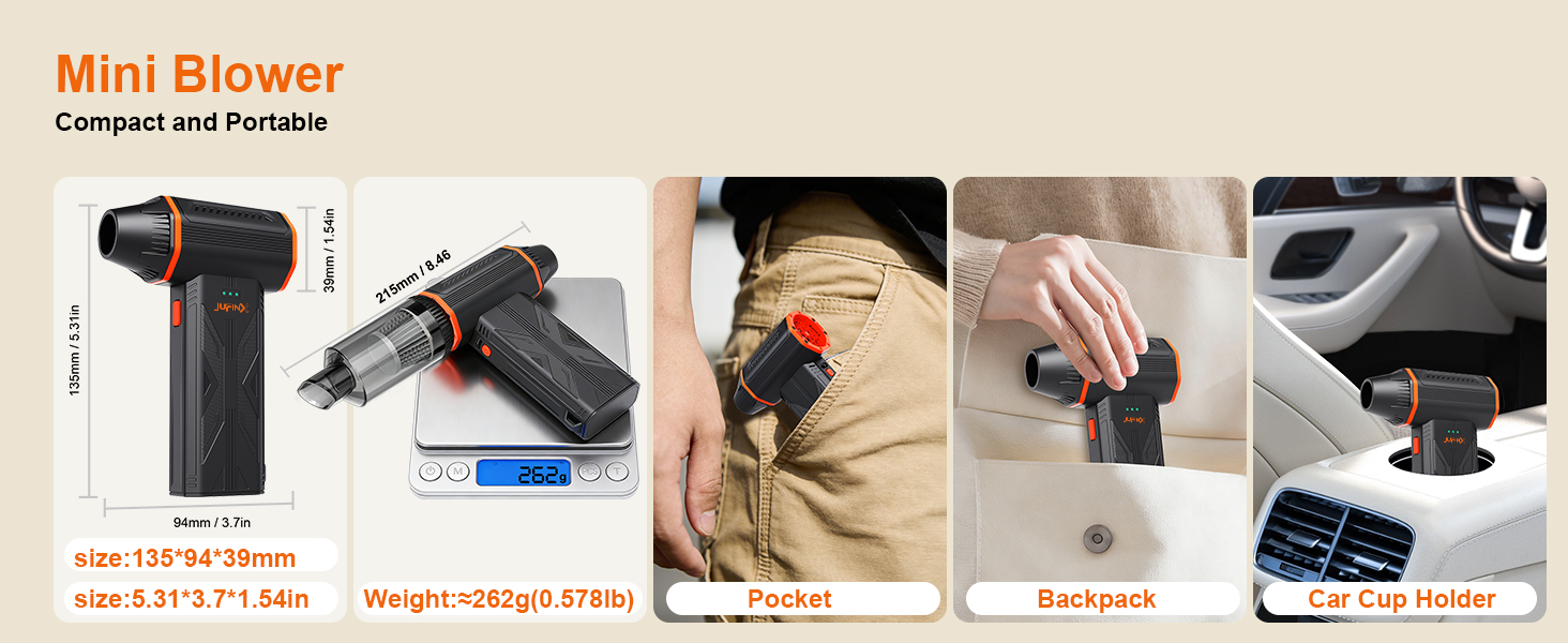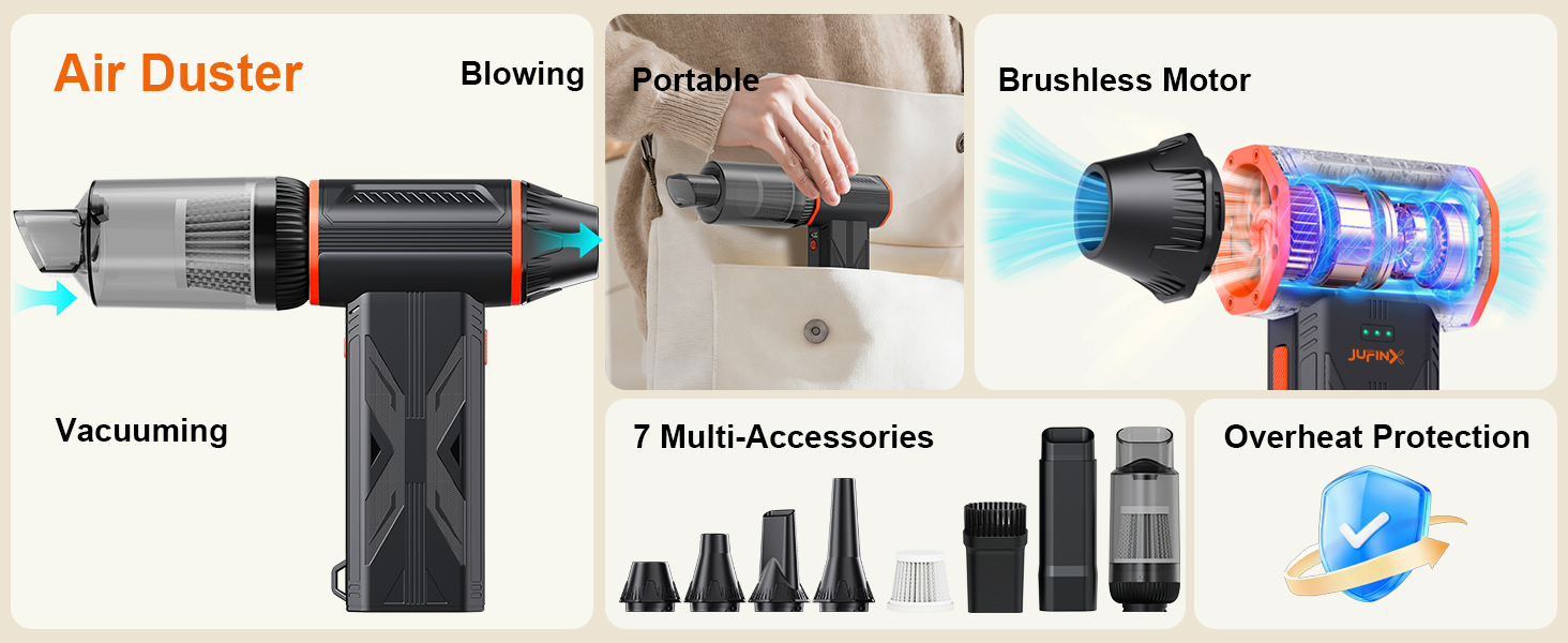 Multi functional cleaning tool: JUFINX electric air duster has 4 nozzles, 2 brushes, and a vacuum cleaner compartment, which can meet different cleaning tasks. The lightweight design makes it suitable for carrying in backpacks or car glove boxes.