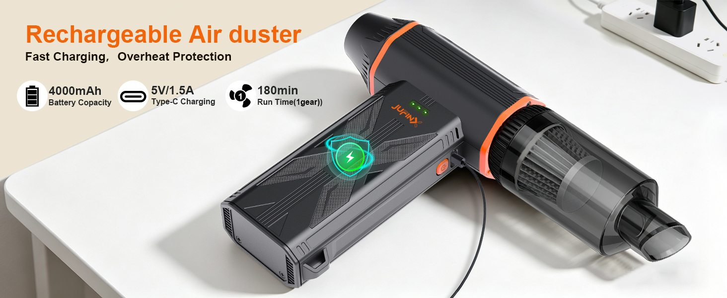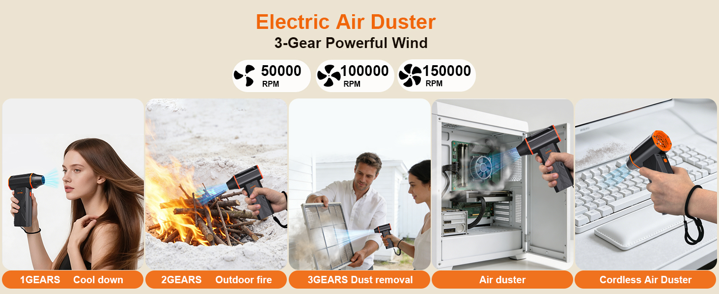 Super Power Air Duster: F32MAX Engineered with a brushless motor reaching up to 150,000 RPM in third gear. This electric air duster blasts away microscopic dust and crumbs from keyboards, computer cases, and radiator fans. It features three adjustable speed settings to suit different cleaning tasks.